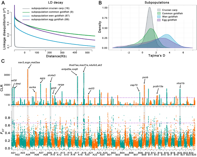 LD及群體選擇分析支持了前期的假設(shè),即金魚馴化過程中種群遺傳瓶頸效應(yīng)的存在和強(qiáng)烈的人工選擇(圖5 A)。進(jìn)一步的遺傳多樣性分析發(fā)現(xiàn),由于人工選擇的結(jié)果,從鯽魚和普通金魚的馴化過程中遺傳多樣性的增加,表明了從鯽魚馴化后,金魚重要遺傳變異的積累(圖5 B);33個金魚個體和16個野生鯽魚個體的群體選擇分析發(fā)現(xiàn)了50個受選擇區(qū)域(25.2 Mb區(qū)間內(nèi),共計946個基因)(圖5 C),940個候選基因中大部分與形態(tài)發(fā)生,色素沉著,行為,免疫反應(yīng)/傳染病,能量代謝和對激素的反應(yīng)有關(guān);進(jìn)一步通過以上201個個體的選擇性清除分析發(fā)現(xiàn)393個基因受選擇,其中21個代表性候選基因中,有13個與在斑馬魚中存在敲除系的基因同源,這些敲除系顯示與行為相關(guān)的突變表型(pcdh15aagrp),眼睛大小減?。?em>ndufs5),細(xì)胞遷移(nav3zap70)或腦大小減?。?em>aurka)。