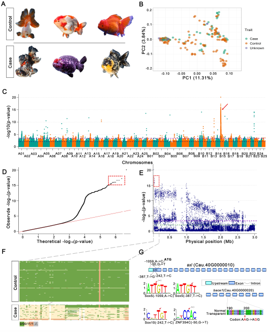 ??? 透明的金魚突變體首次記錄于1579年,是孟德爾遺傳學(xué)在魚類甚至脊椎動物中的典型案例,在T / t基因座上的優(yōu)勢表達(dá)不完全。本研究中利用48個實驗個體和127個對照個體進(jìn)行全基因組關(guān)聯(lián)分析(圖7 A-C),發(fā)現(xiàn)在B15染色體臂上的5個SNPs與T / t基因座上的不完全優(yōu)勢遺傳模式相吻合。與同源染色體15相比,在該區(qū)域發(fā)生了倒位。在候選區(qū)域ChrB15:28,558?153,105中,鑒定了基因Cau.B15G0000010(ChrB15:48,888?76,549),其編碼酪氨酸蛋白激酶受體UFO-like蛋白,在5′-UTR區(qū)的預(yù)測轉(zhuǎn)錄因子結(jié)合位點包含四個SNPs(圖7 G)。白細(xì)胞酪氨酸激酶與斑馬魚的色素細(xì)胞發(fā)育有關(guān),并且受體酪氨酸激酶家族的成員在人類黑色素瘤的發(fā)育中起著作用,盡管目前該基因家族的作用在金魚中尚不清楚。在金魚中,酪氨酸蛋白激酶受體可能調(diào)節(jié)酪氨酸激酶,從而導(dǎo)致色素沉著變化,在該區(qū)域內(nèi),編碼具有非同義單核苷酸突變的β-分泌酶1-like蛋白(bace1)的Cau.B15G0000020基因與斑馬魚和人的黑素細(xì)胞遷移有關(guān),這可能解釋在透明鱗片的金魚上出現(xiàn)黑色污跡或斑點。盡管功能驗證仍在進(jìn)行中,但研究中認(rèn)為酪氨酸蛋白激酶受體是金魚T / t基因座的強(qiáng)力候選基因。