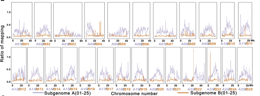 在過去的50年里,一直推測金魚基因組是四倍體。近期研究表明,鲃亞科Barbinae (2n = 50) 中的鯉魚科可能是金魚最接近的二倍體祖先,進(jìn)而形成這樣一個假說:鲃亞科(Barbinae)可能是二倍體金魚譜系的祖先種,研究中進(jìn)一步進(jìn)行了6個代表性的二倍體鲃亞科物種(包括條紋小鲃,大鱗高須魚,長臀鲃,黑鰭袋唇魚,施氏魮和裂峽鲃)的全基因組鳥槍測序并進(jìn)行基因組組裝。金魚染色體可清晰分為兩個亞基因組,通過reads多序列比對,發(fā)現(xiàn)金魚來自兩個祖先世系,其中一個是鲃亞科共有的,進(jìn)一步將與鲃亞科比例高的reads所在染色體定為A亞基因組(ChrA01~A25)并將其余染色體定為B亞基因組 (ChrB01~B25)(圖2)。此外,基于1個核基因的系統(tǒng)進(jìn)化分析,即結(jié)締組織生長因子like基因在二倍體金魚中僅有1個拷貝,但在四倍體金魚中含有2個拷貝,結(jié)果顯示鲃亞科物種的同源基因與金魚A亞基因組同源基因聚類到一起(斑馬魚和鯉魚作外群)。研究結(jié)果表明,A亞基因組可能起源于鲃亞科內(nèi)的祖先物種,而B亞基因組的二倍體祖先可能已經(jīng)滅絕或起源于未知的鯉科魚類譜系,推測金魚的起源可能是由于異源多倍化事件。金魚的A和B亞基因組分別包含28,133和26,141個基因。同時通過金魚10個不同組織的RNA-seq測序,探索了A和B兩個亞基因組之間的差異表達(dá),發(fā)現(xiàn)同源基因在兩個亞基因組之間表現(xiàn)出不對稱的表達(dá)模式,而全基因組范圍內(nèi)的表達(dá)水平總體上更偏好A亞基因組。