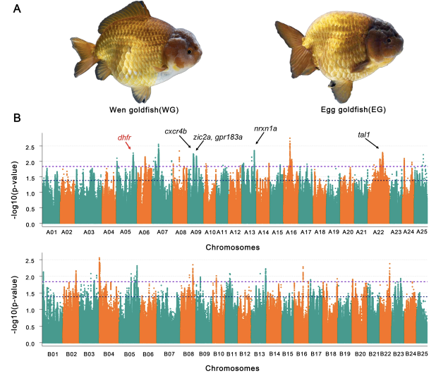 背鰭作為金魚一重要的表型特征,在不同變種中形態(tài)不一,背鰭是區(qū)分Wen金魚和Egg金魚的顯著特征,背鰭的縮小是Egg金魚進(jìn)化的關(guān)鍵特征。通過Wen金魚和Egg金魚雜交后代F1背鰭性狀分離比,暗示了了背鰭特征受多個基因位點控制,可能具有母體遺傳效應(yīng)。對96只有背鰭和87只無背鰭金魚的全基因組關(guān)聯(lián)分析GWAS研究分析發(fā)現(xiàn)跨越13條染色體上的8.96 Mb區(qū)域上的378個基因與背鰭性狀相關(guān)(圖6),85.2% (322)個基因位于A亞基因組,大部分位于五條染色體上,包括ChrA09,ChrA07,ChrA22,ChrA16和ChrA05,比位于B亞基因組上的背鰭相關(guān)基因的數(shù)量高得多,這表明背鰭相關(guān)基因不對稱的亞基因組分布,GO和KEGG分析表明,該性狀的候選基因可能參與了“細(xì)胞表面受體信號傳導(dǎo)”途徑,“信號轉(zhuǎn)導(dǎo)”,“跨膜轉(zhuǎn)運(yùn)”,“骨骼系統(tǒng)發(fā)育”和“初級代謝過程和器官氮化合物代謝過程”。進(jìn)一步通過與斑馬魚直系同源基因基因敲除品系表現(xiàn)出的突變表型分析發(fā)現(xiàn),二氫葉酸還原酶(dhfr)可能在某種程度上與魚鰭是否存在相關(guān),該基因可能在金魚人工選擇過程中,在有無背鰭這一表型中發(fā)揮重要作用。