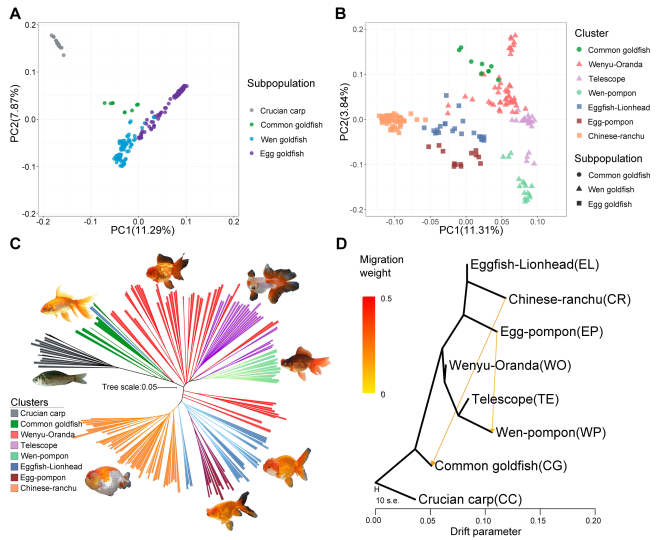 通過201個個體(16只野生鯽魚和185只代表性金魚變種,平均測序深度12.5 x)的系統(tǒng)發(fā)育樹構(gòu)建發(fā)現(xiàn)普通金魚與鯽魚親緣關(guān)系最近(圖4 A-C),進(jìn)一步結(jié)合系統(tǒng)發(fā)育樹和PCA分析確定各金魚變種的系統(tǒng)分化關(guān)系,區(qū)分普通金魚和卵金魚(無背鰭)和溫金魚(有背鰭),無背鰭金魚和有背鰭金魚進(jìn)一步分為不同的亞群。