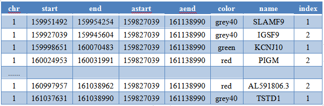 首先用你能用的辦法將目標(biāo)區(qū)域(1:160000000-161000000)內(nèi)的基因、目標(biāo)區(qū)域上游的兩個基因、目標(biāo)區(qū)域下游的一個基因的位置都提取出來,然后為每個基因賦一個顏色。中間灰色的bar兩端的突出可以從第一個基因的開始位置向上游擴(kuò)100K、最后一個基因的結(jié)束位置向下游擴(kuò)100K。整理成作圖用的輸入文件,如下:
