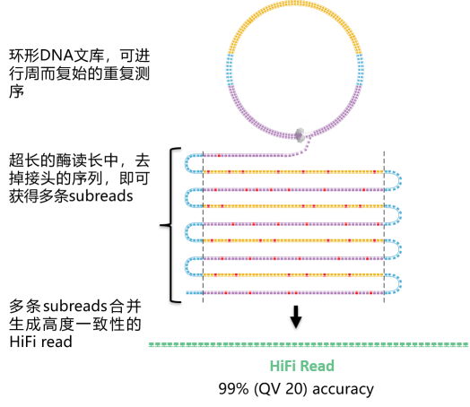 HiFi reads(High Fidelity reads)是2019年由PacBio推出的基于環(huán)化共有序列(Circular Consensus Sequencing,CCS)模式產(chǎn)生的既兼顧長(zhǎng)讀長(zhǎng)(10-20kb的長(zhǎng)度)又具有高精度(>99%z確率)的測(cè)序結(jié)果。
