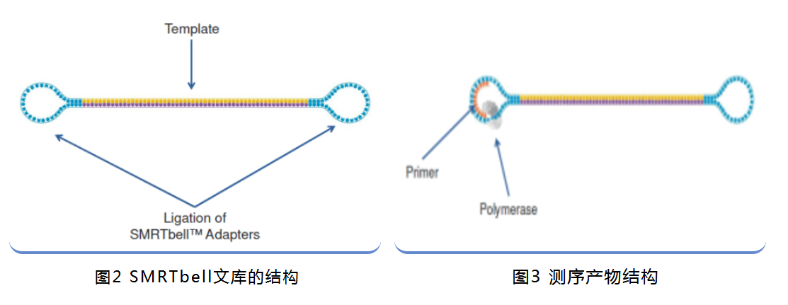 bell即“鈴”的意思,如圖2,構(gòu)建完成的bell文庫形狀就如同一個(gè)啞鈴。其主要組成部分是:發(fā)卡狀的接頭(Hairpin Adapter)和雙鏈DNA模板(Double Stranded DNA Template)。而文構(gòu)建完成后、測(cè)序前還需要完成bell文庫、Sequencing Primer、DNA Polymerase的混合工作(測(cè)序引物退火結(jié)合bell文庫,然后引物-bell文庫復(fù)合物結(jié)合DNA聚合酶)。最終產(chǎn)物如圖3所示。