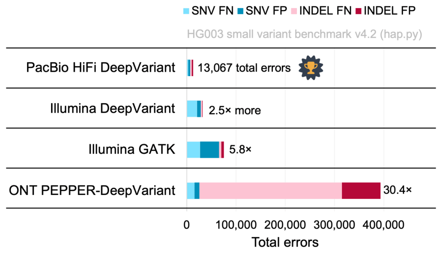 另外,由下圖可以看出(圖7),Google DeepVariant使用HiFi數(shù)據(jù)提交的結(jié)果在所有單一技術(shù)檢測(cè)全基因組范圍內(nèi)的變異z確性*高,對(duì)SNV√確度和召回率可以達(dá)到99.9%,對(duì)插入缺失的√確度和召回率可以達(dá)到99.4%[2]。