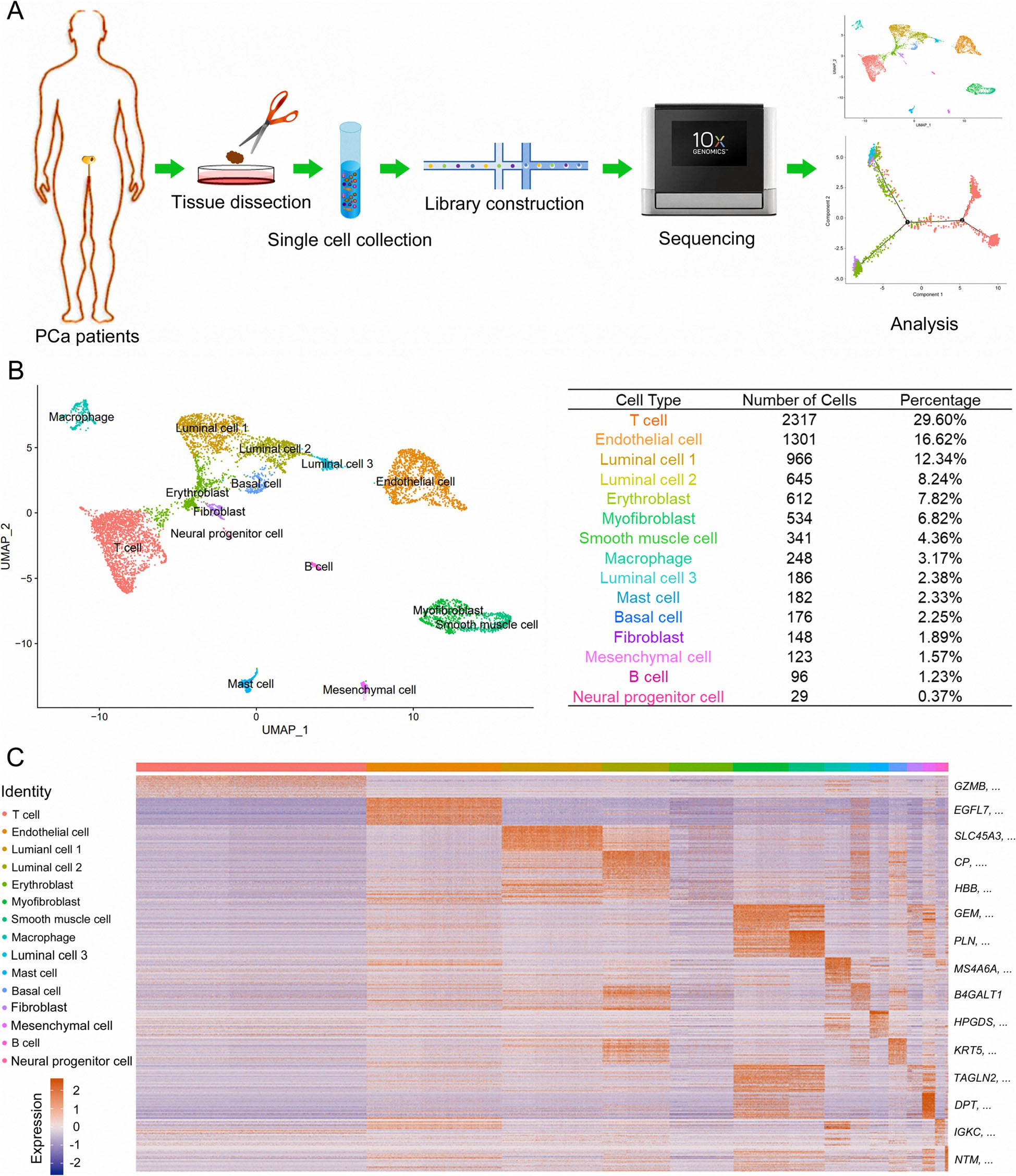 兩名患者通過前列腺組織中AMACR的過度表達(dá)和TP63的缺失表達(dá)被診斷為PCa。收集兩名患者的癌樣,解剖并消化成單個(gè)細(xì)胞,用10×基因組學(xué)進(jìn)行scRNA-seq(圖1a)。共有7904個(gè)合格細(xì)胞用于進(jìn)一步分析。通過PCA對(duì)所有細(xì)胞進(jìn)行無偏聚類,UMAP可視化細(xì)胞成分(圖1b)。通過DEG分析確定了15個(gè)主要簇的特征基因:T細(xì)胞、內(nèi)皮細(xì)胞、1型管腔細(xì)胞、2型管腔細(xì)胞、紅細(xì)胞、肌成纖維細(xì)胞、平滑肌細(xì)胞、巨噬細(xì)胞、3型管腔細(xì)胞、肥大細(xì)胞、基底細(xì)胞、成纖維細(xì)胞、間充質(zhì)細(xì)胞、B細(xì)胞和神經(jīng)內(nèi)分泌細(xì)胞(圖1c)。