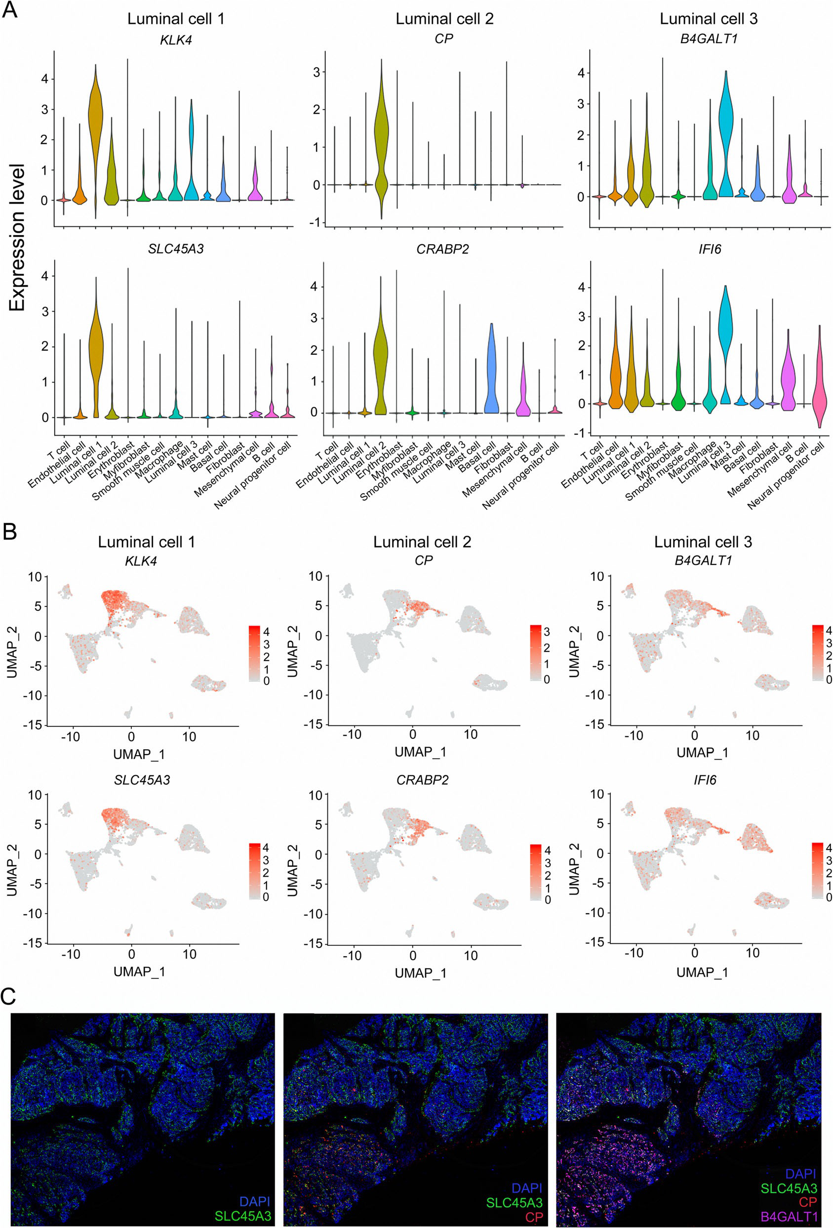 在本文的數(shù)據(jù)中,根據(jù)管腔標(biāo)志物在PCa樣本中的高表達(dá)水平,確定了3種類型的管腔細(xì)胞,包括角蛋白8(KRT8)和角蛋白18(KRT18)。為了表征這些管腔簇,作者用VlnPlot和FeaturePlot分別檢測了各自標(biāo)記基因的表達(dá)模式。結(jié)果表明,這些溶解酶(k4a)可作為特異性的載體(k4a)表達(dá)于細(xì)胞內(nèi)(k4a4)。銅藍(lán)蛋白(CP)在2型管腔細(xì)胞中唯一表達(dá),而細(xì)胞維甲酸結(jié)合蛋白2(CRABP2)在間充質(zhì)細(xì)胞以及2型和3型管腔細(xì)胞中高表達(dá),這表明CP更適合2型管腔細(xì)胞(圖2a,b)。與其他簇相比,3型管腔細(xì)胞表現(xiàn)出更高水平的β-1,4-半乳糖基轉(zhuǎn)移酶1(B4GALT1)和干擾素α誘導(dǎo)蛋白6(IFI6)的表達(dá)水平,表明B4GALT1和IFI6可以識(shí)別這些細(xì)胞(圖2a,b)。為了研究PCa組織中每種類型管腔細(xì)胞的細(xì)胞學(xué)定位,我們使用抗SLC45A3、抗CP、抗B4GALT1抗體進(jìn)行免疫染色,并用DAPI復(fù)染組織切片(圖2c)。SLC45A3在前列腺組織的大多數(shù)管腔細(xì)胞中表達(dá)(圖2c)。相反,在一小部分管腔細(xì)胞中檢測到低表達(dá)水平的SLC45A3(圖2c)。不同類型的癌細(xì)胞在T1區(qū)的發(fā)育不完全相同(圖2 c)。