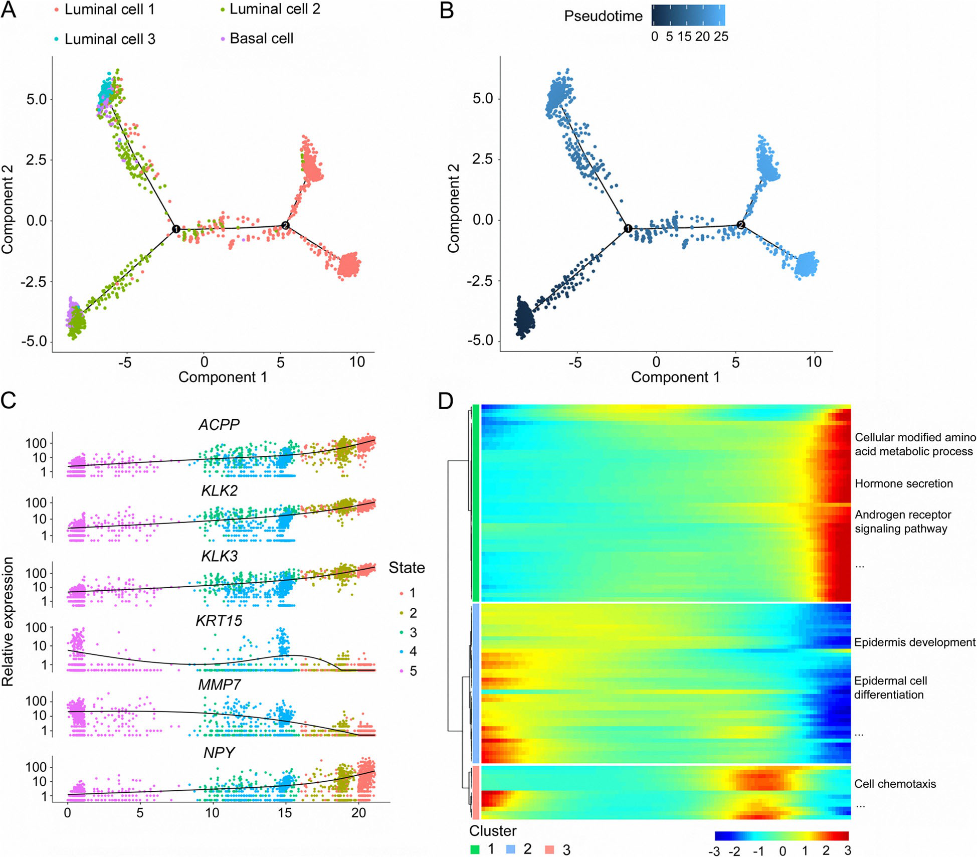 作者進(jìn)一步分析了基因沿軌跡的動(dòng)態(tài)表達(dá)變化,以確定PCa進(jìn)展的關(guān)鍵基因。表達(dá)變化最顯著的基因包括:酸性磷酸酶、前列腺(ACPP)、激肽釋放酶相關(guān)肽酶2(KLK2)、KLK3、角蛋白15(KRT15)、基質(zhì)金屬肽酶7(MMP7)和NPY(圖4c)。此外,作者對(duì)前100個(gè)基因進(jìn)行了擬時(shí)間表達(dá)模式的聚類分析,并分析了每個(gè)簇的功能豐富程度。聚類1中的基因高度表達(dá)于終末期,主要富集于PCa起始和進(jìn)展相關(guān)的過程,包括細(xì)胞修飾的氨基酸代謝過程、激素分泌和AR信號(hào)通路(圖4d)。第二類基因在前列腺發(fā)育初期表現(xiàn)出高表達(dá)水平,主要參與表皮發(fā)育和表皮細(xì)胞分化,提示其在前列腺正常發(fā)育中的潛在作用(圖4d)。聚類3中的大多數(shù)基因在假時(shí)間軌跡的中間階段表達(dá)增加,并在細(xì)胞趨化性中富集(圖4d)。