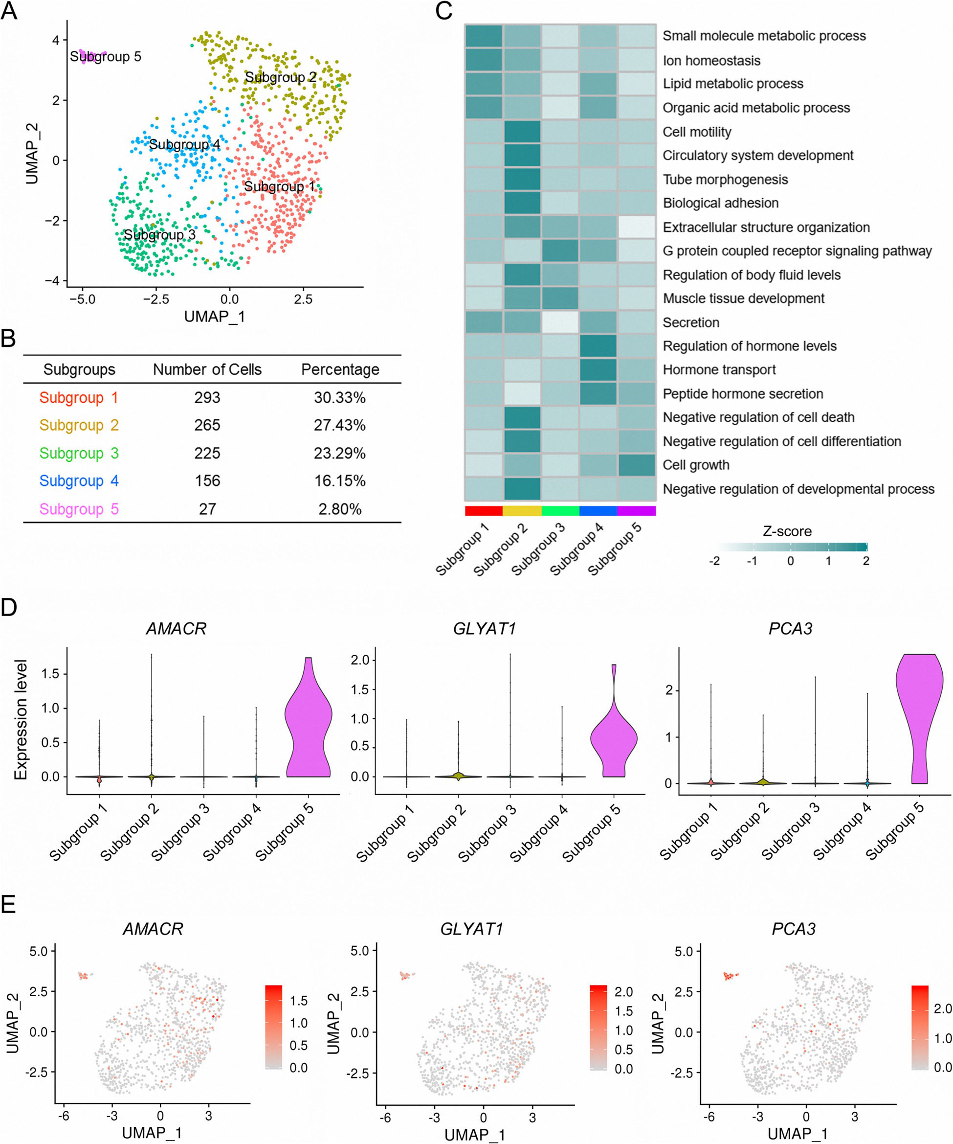 作者首先分析來自TCGA的公共PCa患者中每個(gè)管腔標(biāo)志基因的表達(dá)水平,以檢驗(yàn)它們與PCa發(fā)生和發(fā)展的臨床相關(guān)性。相比之下,大多數(shù)1型管腔標(biāo)記基因在惡性程度較低的前列腺癌中的表達(dá)高于惡性程度高或正常前列腺,這表明在前列腺癌的發(fā)生和早期發(fā)展中有潛在的作用(補(bǔ)充圖5)。因此,作者對(duì)1型管腔細(xì)胞進(jìn)行了亞聚類,以確定引起PCa的亞群。PCA將1型管腔細(xì)胞分為5個(gè)亞組(圖5a,b)。分析每個(gè)亞組標(biāo)記基因的功能富集,亞組1與腫瘤細(xì)胞有絲分裂準(zhǔn)備所必需的生物分子代謝過程有關(guān),如脂質(zhì)代謝過程和有機(jī)酸代謝過程(圖5c)。與其他亞組相比,亞組2與細(xì)胞運(yùn)動(dòng)、管形態(tài)發(fā)生和細(xì)胞死亡負(fù)調(diào)控有關(guān),這些過程對(duì)腫瘤的遷移和生長至關(guān)重要(圖5c)。亞組3主要參與G蛋白偶聯(lián)受體信號(hào)通路和肌肉組織發(fā)育(圖5c)。第4亞組與PCa相關(guān)的過程,包括激素水平的調(diào)節(jié),激素轉(zhuǎn)運(yùn)和肽激素轉(zhuǎn)錄(圖5c)。相比之下,第5亞群的獨(dú)特功能主要集中在細(xì)胞生長(圖5c)。VlnPlot和特征圖顯示,AMACR、甘氨酸鈉基轉(zhuǎn)移酶樣1(GLYATL1)和PCA3在5亞組中特異表達(dá)(圖5d,e)。有趣的是,AMACR是一種在前列腺癌中高度表達(dá)的過氧化物酶體酶,參與支鏈脂肪酸和膽汁酸中間產(chǎn)物的β-氧化,對(duì)PCa的發(fā)生和發(fā)展至關(guān)重要。PCA3是一種非編碼RNA,在PCa細(xì)胞系、原發(fā)組織甚至PCa患者尿液中高表達(dá)。這兩個(gè)5亞組的標(biāo)記物已經(jīng)被用于PCa的診斷和分層,這意味著5亞組可能是臨床上PCa診斷和分層所必需的一組不同的細(xì)胞。
