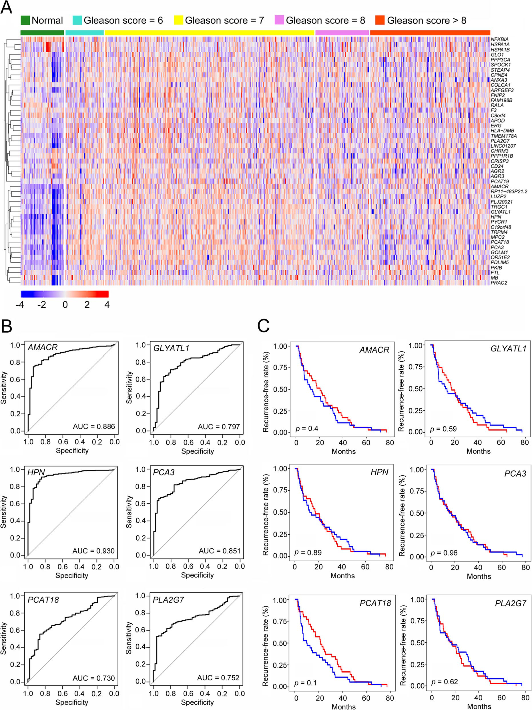 分析TCGA患者Ⅰ型管腔亞群的臨床相關(guān)性及其標(biāo)記基因的表達(dá)模式。正常前列腺中大多數(shù)1-4亞組標(biāo)記基因的表達(dá)水平與PCa組織中的相似甚至更高。相比之下,第5亞組的標(biāo)記基因在PCa組織中高表達(dá),尤其是在Gleason評(píng)分為6或7的患者中,這表明在PCa的發(fā)生和早期發(fā)展中有潛在的作用(圖6a)。通過ROC分析,我們進(jìn)一步鑒定了5亞組中6個(gè)特異性和敏感性最高的標(biāo)記基因,包括AMACR、GLYATL1、HPN、前列腺癌基因PCA3,前列腺癌相關(guān)轉(zhuǎn)錄物18(PCAT18)和磷脂酶A2第七組(PLA2G7)(圖6b)?;?-基因集的ROC分析顯示了很強(qiáng)的PCa預(yù)測能力,AUC得分為0.937。此外,這些基因的表達(dá)模式不僅區(qū)分了PCa與正常前列腺,而且區(qū)分了早期PCa(Gleason評(píng)分=6)和高度惡性PCa(Gleason評(píng)分≥8)。許多PCa患者在1-2年內(nèi)表現(xiàn)出抗藥性,并復(fù)發(fā)為晚期PCa,如CRPC。第5亞組可能有助于PCa復(fù)發(fā)。然而,Kaplan-Meier分析顯示,這些基因在生化復(fù)發(fā)中沒有明顯的預(yù)測能力,無論是單獨(dú)的還是作為一個(gè)基因集(圖6c)??傊?亞組的惡性細(xì)胞是PCa診斷和分層的關(guān)鍵,但與生化復(fù)發(fā)無關(guān)。