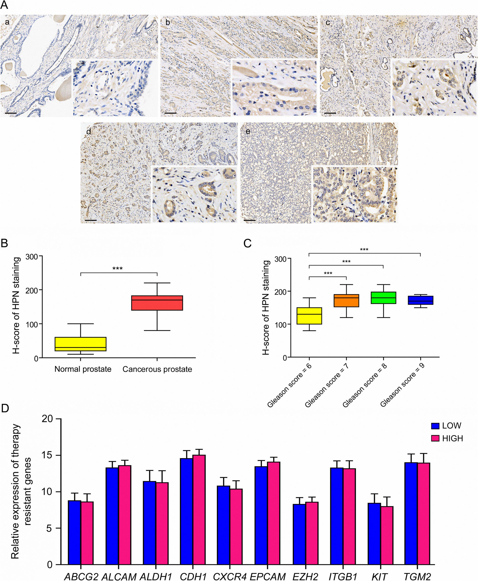 不同病理分級(jí)的癌組織之間(圖7a)。為了檢驗(yàn)強(qiáng)度差異作者進(jìn)一步用Hscore分析免疫染色評(píng)分,發(fā)現(xiàn)HPN在癌組織中的表達(dá)水平顯著增強(qiáng)(圖7b)。此外,高病理分級(jí)(Gleason評(píng)分=7,8,9)的腫瘤組織中HPN的表達(dá)水平顯著高于病理分級(jí)較低(Gleason評(píng)分=6)(圖7c)。因此,作者認(rèn)為HPN可能是臨床PCa診斷和分層更為特異、敏感的生物標(biāo)志物。為了探討HPN在預(yù)測PCa復(fù)發(fā)中的作用,作者根據(jù)HPN的表達(dá)水平將TCGA患者分為低和高兩組,然后分析了治療依從性標(biāo)記物的表達(dá),包括ATP結(jié)合盒亞家族G成員2(ABCG2)、醛脫氫酶1(ALDH1)、受體酪氨酸激酶(KIT)的表達(dá),活化白細(xì)胞粘附分子。