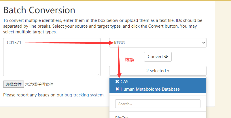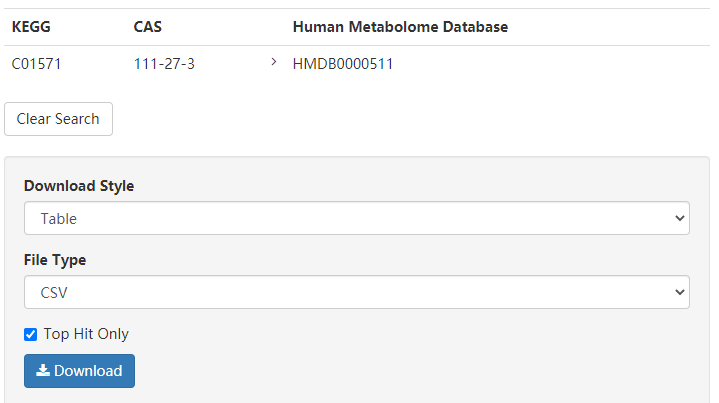 通過前面的檢索頁面我們會(huì)發(fā)現(xiàn)相同的代謝物在不同數(shù)據(jù)庫的ID不一樣,不要慌,小編給大家推薦一個(gè)好用的ID轉(zhuǎn)換網(wǎng)站:http://cts.fiehnlab.ucdavis.edu/batch。這個(gè)網(wǎng)站支持多種數(shù)據(jù)庫,而且可以批量哦!。以C01571(類型為KEGG)為例,查詢其CAS和HMDB信息,見下圖: