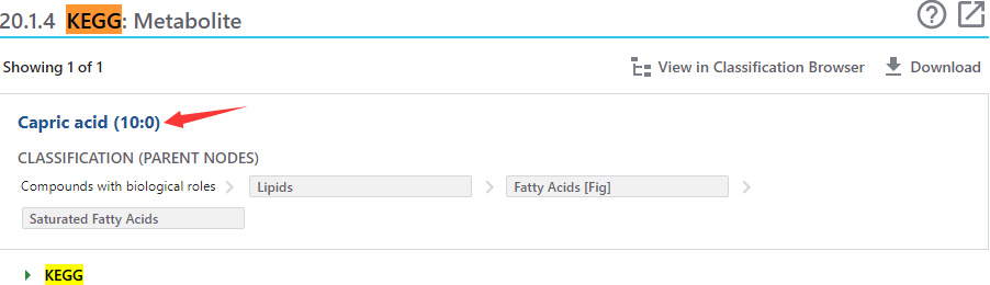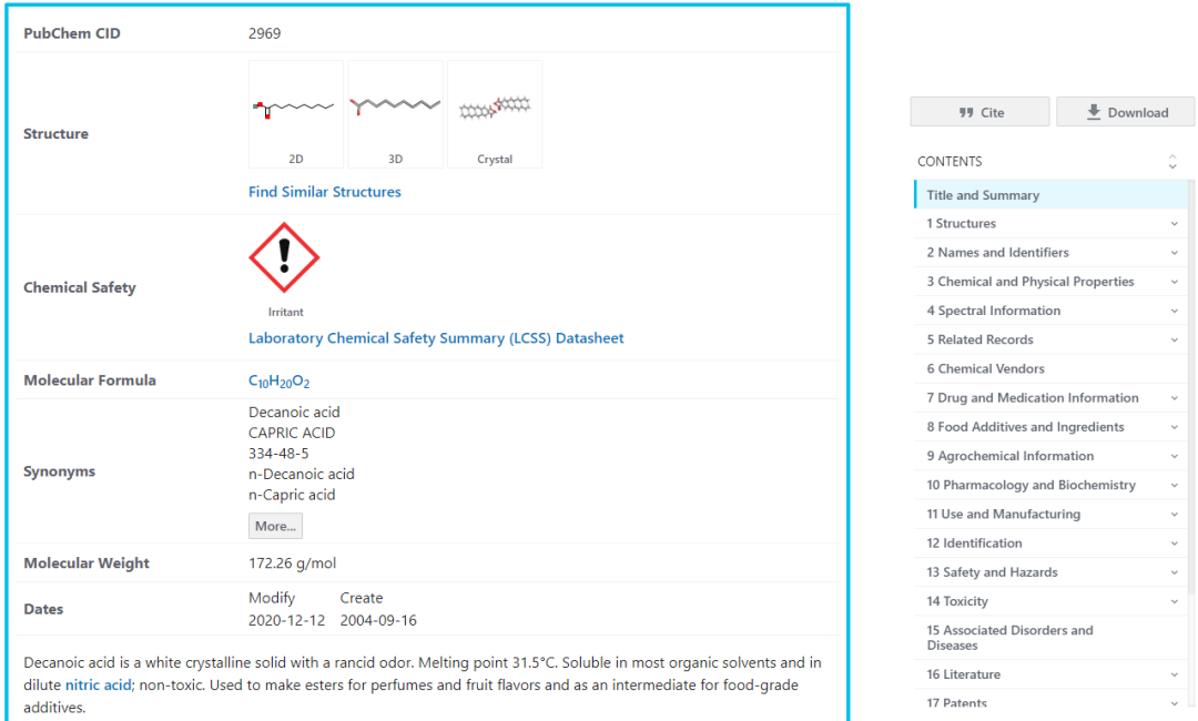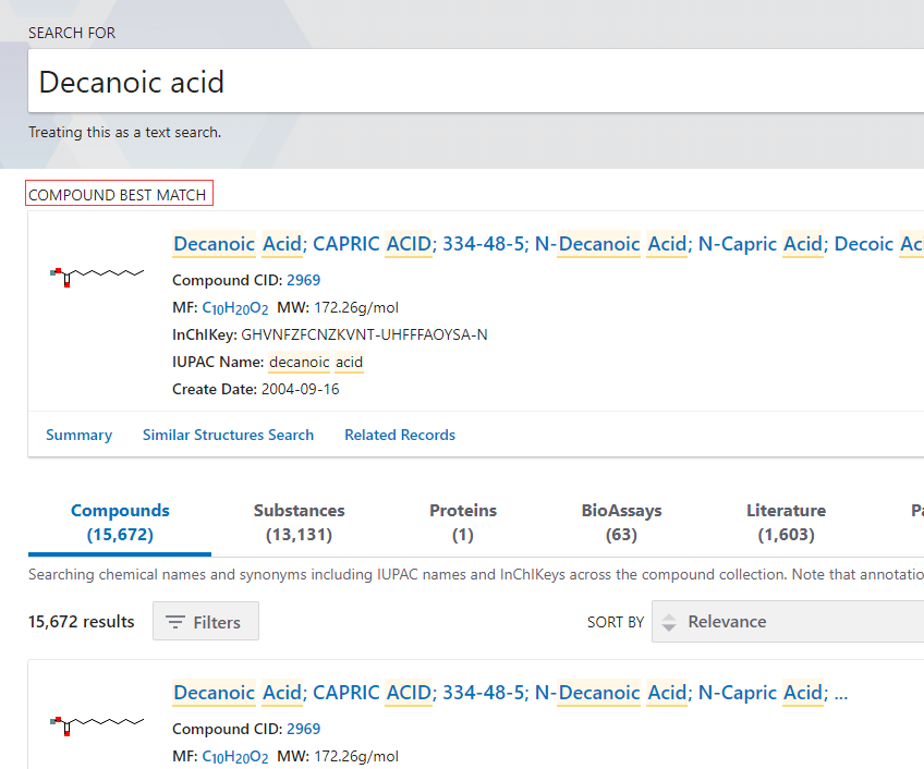 Pubchem(https://pubchem.ncbi.nlm.nih.gov/),它是NCBI下的一個(gè)大型的、綜合性的化合物數(shù)據(jù)庫,目前收錄了1億多種化合物信息,支持名稱、縮寫、化學(xué)式、系統(tǒng)命名等多種方式檢索,其結(jié)果包含了化合物的各種命名、相關(guān)聯(lián)的數(shù)據(jù)庫信息、結(jié)構(gòu)、分類、理化性質(zhì)、文獻(xiàn)、質(zhì)譜圖等多種信息。其中頁面開頭的摘要部分可快速了解到該物質(zhì)的特性、生物功能等信息,根據(jù)提供的文獻(xiàn)信息可幫助我們了解目前的研究情況。今天小編以“癸酸”為例教大家如何快速了解一個(gè)陌生的代謝組化合物。首先我們在主頁搜索欄中輸入癸酸英文名Decanoic acid,點(diǎn)擊搜索后會(huì)得到多個(gè)結(jié)果,置頂?shù)囊话銥樽罴哑ヅ?,這里是完全一致的,可以確認(rèn)就是這個(gè)結(jié)果。