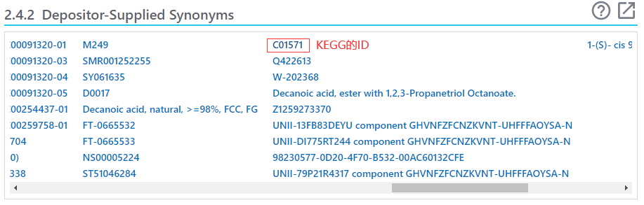 接下來,我們可能想找到這個(gè)化合物對(duì)應(yīng)的KEGG注釋信息,這里介紹兩種快速簡單的方法:一種是點(diǎn)擊右側(cè)導(dǎo)航欄的Names and Identifiers(一般是第二項(xiàng)),在跳轉(zhuǎn)地方找到Depositor-Supplied Synonyms(可使用Ctrl+F輸入關(guān)鍵詞搜索)同義詞列表,了解KEGG數(shù)據(jù)庫的熟手可以一眼找到對(duì)應(yīng)的KEGG ID為C01571。