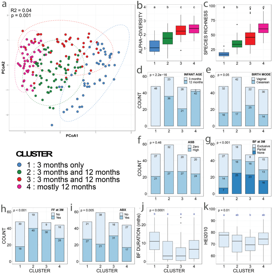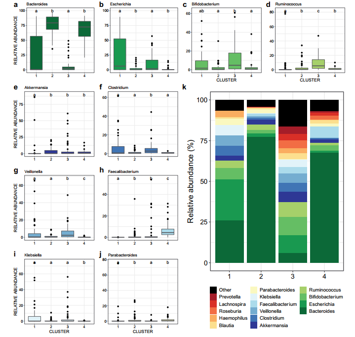 基于微生物群落組成,嬰兒糞便樣品聚類成四組(圖1-2)。腸道細(xì)菌物種豐富度(圖1b)、alpha(圖1c)、beta(圖1a)和分類學(xué)組成(圖2)在clusters之間存在差異,反應(yīng)了顯著的菌落差異。Cluster1僅包含了3個(gè)月的樣本、cluster4幾乎包括所有12個(gè)月的樣本,cluster2和3由3個(gè)月和12個(gè)月的樣本混合組成。Cluster3包括較高比例的分娩時(shí)期使用抗生素的母親、剖腹產(chǎn)出生的嬰兒和配方奶粉喂養(yǎng)(圖1)。然而,在不同clusters中母親ASB消耗量沒有差異,這表明這種暴露并不影響clusters的分類(圖1f)。