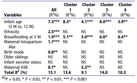 接下來,作者對(duì)不同cluster進(jìn)行了beta多樣性分析。Envfit單變量模型為每個(gè)cluster確定了不同的驅(qū)動(dòng)因素(圖3a)。Cluster1中beta多樣性的驅(qū)動(dòng)因素主要是母親因素,而cluster4的驅(qū)動(dòng)因素主要是嬰兒因素(圖3a)。Cluster2是唯一的母親ASB攝入與beta多樣性相關(guān),單變量分析和多變量分析均得到證實(shí)(圖3a和表2)。