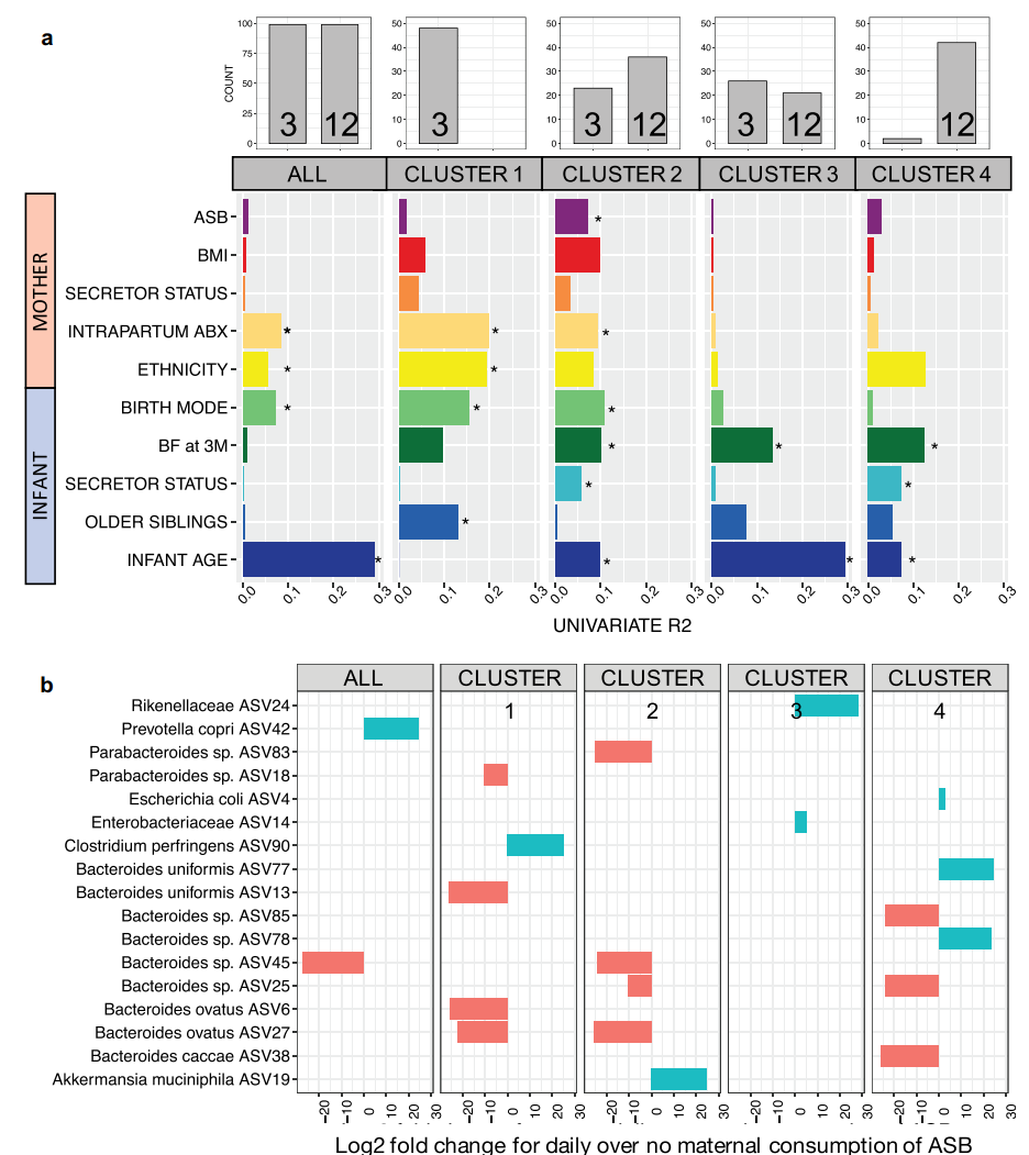 Envfit分析(單變量模型)確定了13個(gè)變量作為腸道細(xì)菌多樣性的重要驅(qū)動(dòng)因素,從中我們選擇了8個(gè)非冗余變量來構(gòu)建我們的模型:嬰兒年齡、母親生產(chǎn)時(shí)使用抗生素、母親的種族、分娩方式、3個(gè)月時(shí)母乳喂養(yǎng)狀況、是否有兄弟姐妹、嬰兒分泌物狀況和母親的ASB消耗量(圖3a)。完整的數(shù)據(jù)集中顯著的預(yù)測因素是嬰兒的年齡、母親的種族、生產(chǎn)時(shí)使用抗生素和分娩方式。同樣的四個(gè)變量加上3個(gè)月時(shí)母乳喂養(yǎng)狀況,在一個(gè)多變量模型中進(jìn)行了測試,解釋了14.2%群落變異(表2)。僅在多變量模型中,母親食用ASB是嬰兒腸道細(xì)菌組學(xué)的顯著預(yù)測因子(表2)。分娩方式、生產(chǎn)時(shí)抗生素和3個(gè)月時(shí)母乳喂養(yǎng)狀況也對(duì)群落組成有顯著影響,但低于嬰兒年齡和母親種族(表2)。