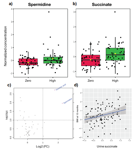 使用MetaboAnalyst軟件確定了20種不同的代謝物。由于代謝組中的功能特征反應(yīng)了微生物代謝的冗余性,并且不太容易受到分類學(xué)數(shù)據(jù)集典型個(gè)體間差異的影響,作者測試了3個(gè)月和12個(gè)月時(shí)母親ASB消耗量對(duì)完整數(shù)據(jù)顯著的影響。兩種尿液代謝物亞精胺和琥珀酸在暴露于ASB的3個(gè)月嬰兒中顯著升高(圖4)。