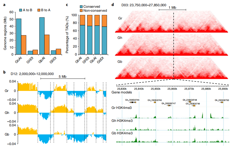 與祖先材料做研究比較更是多倍體中亙古不變的話題。物種在由祖先進(jìn)化、加倍而成現(xiàn)代多倍體材料的過程中,三維結(jié)構(gòu)發(fā)生如何的變化,是否引起相關(guān)功能的差異?例如相比于二倍體亞洲棉陸地棉和海島棉的A/B compartment比較分析,發(fā)現(xiàn)存在大量A到B的轉(zhuǎn)換,以及一定區(qū)域出現(xiàn)了B到A的轉(zhuǎn)換。同時(shí)相對于祖先基因組,亞基因組發(fā)生了不同程度的Compartment的轉(zhuǎn)換,At亞基因組轉(zhuǎn)換明顯高于Dt。