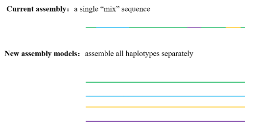 同源多倍體是指所有染色體組來源于一個(gè)個(gè)體的染色體組自我復(fù)制或同一個(gè)物種內(nèi)不同個(gè)體間的雜交與多倍化。通常二倍體基因組裝出單套基因組,異源四倍體能組裝出兩套基因組。而由于早期的技術(shù)限制,同源多倍體物種往往只能組裝1-2套(例如2017年甘薯基因組)。隨著技術(shù)的發(fā)展以及研究的深入,研究者發(fā)現(xiàn)僅單套的基因組數(shù)據(jù)難以完全演示該物種的全面信息。尤其是一些同源多倍體的物種,同源染色體之間不同遺傳位點(diǎn)的組合對生物表型有重要影響,如動(dòng)植物中的雜種優(yōu)勢、某些物種雜交不育現(xiàn)象等。單倍型等位基因間差異對基因表達(dá)、功能及其表型都有著重要影響,大多數(shù)雜交品種的優(yōu)勢表型都受等位基因調(diào)控。