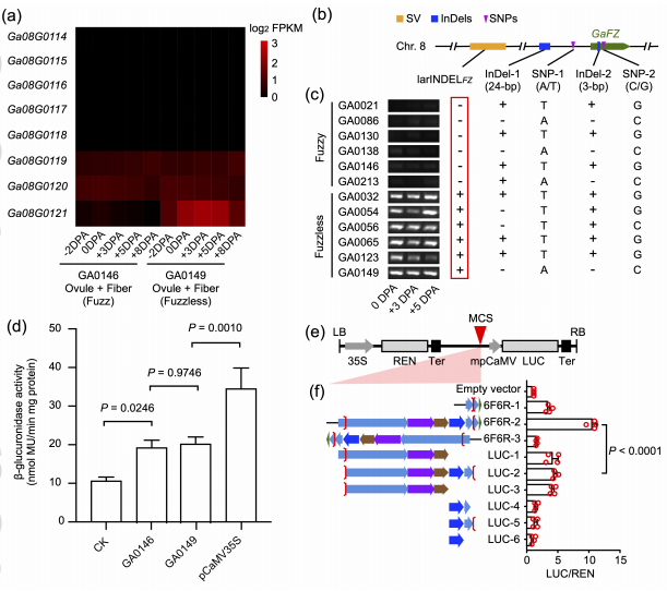 作者對關聯(lián)區(qū)域內(nèi)8個基因的表達模式分析,發(fā)現(xiàn)在短絨發(fā)育起始階段,無絨材料中GaFZ基因表達顯著高于短絨材料(圖3a);從GWAS群體中隨機挑選各6個短絨和無絨材料進行基因和啟動子序列分析,發(fā)現(xiàn)larINDELFZ存在于所有的無絨材料中(圖3b, c);熒光素酶活性分析實驗結果表明,larINDELFZ可能扮演遠端增強子角色特異激活其下游短絨發(fā)育關鍵基因的GaFZ?表達(圖3d, e)