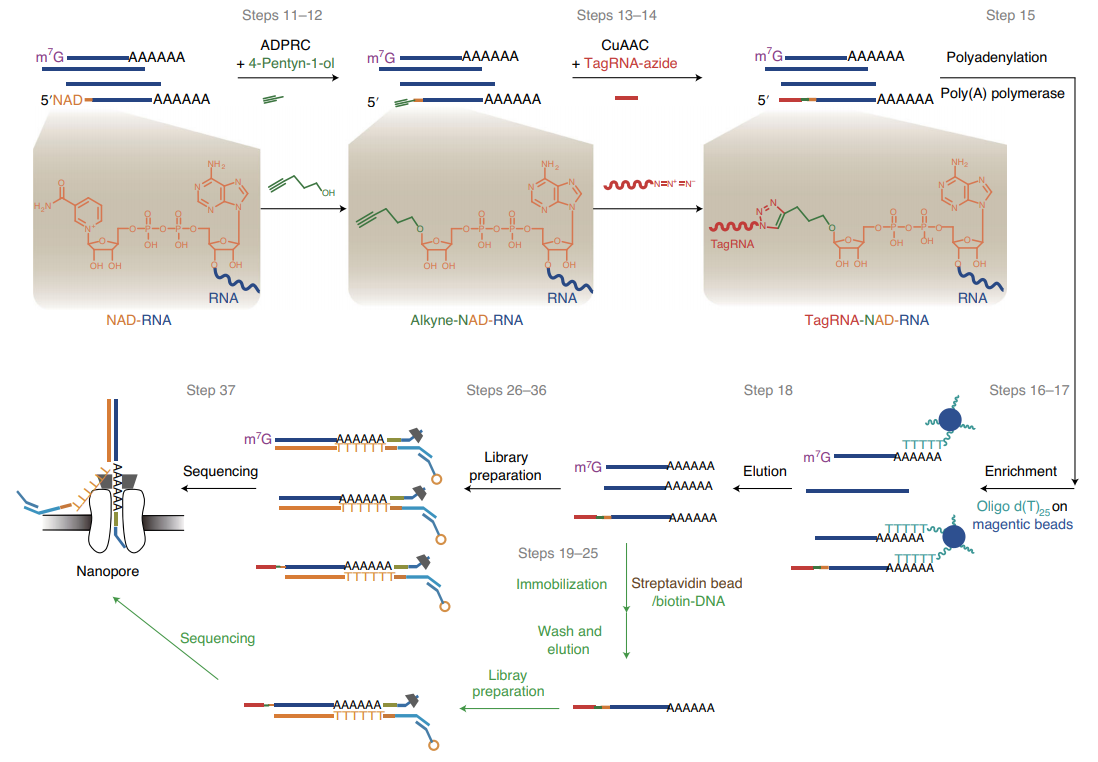 幾年前,開發(fā)了NAD captureSeq,用于NAD-RNA的轉(zhuǎn)錄組范圍分析。在NAD captureSeq中,腺苷二磷酸核糖基環(huán)化酶(ADPRC)用于將NAD +的煙酰胺部分替換為含炔烴的分子,稱為4-戊炔-1-醇。然后通過點(diǎn)擊化學(xué)反應(yīng)(銅催化的疊氮炔炔環(huán)加成(CuAAC))將炔基化產(chǎn)物與生物素疊氮化物連接。用鏈霉親和素樹脂富集生物素標(biāo)記的RNA,然后制備通過二代測(cè)序技術(shù)(NGS)測(cè)序的cDNA文庫(kù)。陰性對(duì)照RNA樣品的處理方法相同,但不使用ADPRC。如果與陰性對(duì)照相比,在ADPRC處理的樣品中富集了特定的RNA,則其某些轉(zhuǎn)錄本被認(rèn)為是NAD +?capped。通過NAD captureSeq,已在細(xì)菌,酵母,植物和人類細(xì)胞中鑒定出NAD-RNA。缺點(diǎn):非生物素化的RNA與鏈霉親和素樹脂的非特異性結(jié)合。由于NAD-RNA水平很低,因此非特異性結(jié)合可能會(huì)顯著降低敏感性并引入誤差。在生物素標(biāo)記過程中RNA的斷裂以及隨后cDNA文庫(kù)的構(gòu)建導(dǎo)致NAD-RNA總體序列結(jié)構(gòu)信息的丟失。