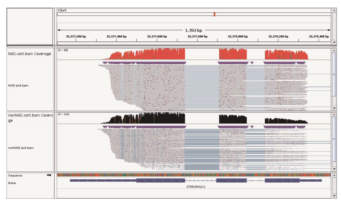 從TagSeek步驟生成的帶標(biāo)簽和不帶標(biāo)簽的reads可以接受TagSeqQuant,它使用Minimap2的默認(rèn)比對(duì)參數(shù)。在TagSeqQuant中,還通過FastQC對(duì)reads進(jìn)行質(zhì)量檢查,并生成一個(gè)html文件以顯示測(cè)序質(zhì)量。經(jīng)過上述分析步驟后,將生成NAD-RNA和非NAD-RNA的基因覆蓋文件,以進(jìn)行IGV可視化(圖3),并生成基因和isoforms的計(jì)數(shù)表以進(jìn)行進(jìn)一步分析。
