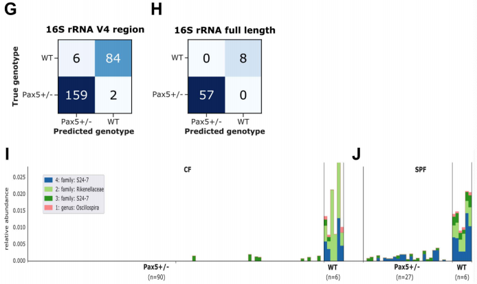 我們通過獨立地將機(jī)器學(xué)習(xí)方法應(yīng)用于3983個ASV,進(jìn)一步將基因型分離ASV的集合細(xì)化到只有40個。ASV根據(jù)特征重要性進(jìn)行排序,由“隨機(jī)森林”算法確定,41個ASV用50%的樣本進(jìn)行訓(xùn)練,并在剩余50%的樣本上進(jìn)行測試。這40個ASV足以準(zhǔn)確(96.8%)預(yù)測小鼠基因型(圖1G)。事實上,這種機(jī)器學(xué)習(xí)工具能夠預(yù)測小鼠的基因型,這證實了Pax5雜合性形成了特定的腸道微生物群落。值得注意的是,16S rRNA全長測序使我們僅使用5212個全長ASV中的4個,就進(jìn)一步提高了Pax5+/-和WT動物之間的基因型預(yù)測的準(zhǔn)確性,準(zhǔn)確率達(dá)到100%(圖1H)。WT和Pax5+/-小鼠微生物群的主要區(qū)別在于Pax5+/-小鼠缺乏完整的共生菌。具體地說,在WT小鼠中可以檢測到的Rikenellaceae、S24-7和Oscillospira屬的成員在CF的Pax5+/-小鼠的微生物群落中缺失(圖1I)。在SPF中,在Pax5+/-小鼠的微生物群落中沒有檢測到Rikenellaceae和Oscillospira屬的成員(圖1J)。