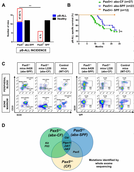 我們考慮了在SPF條件下腸道生理性微生物群的作用,以及在沒有自然感染誘因的情況下,通過細(xì)菌枯竭來改變它是否會導(dǎo)致白血病的發(fā)生。為了測試這一點,另外一組出生在SPF的23只Pax5+/-小鼠沒有被轉(zhuǎn)移到CF,而是在整個實驗過程中一直保持在SPF中。這些小鼠接受抗生素治療。