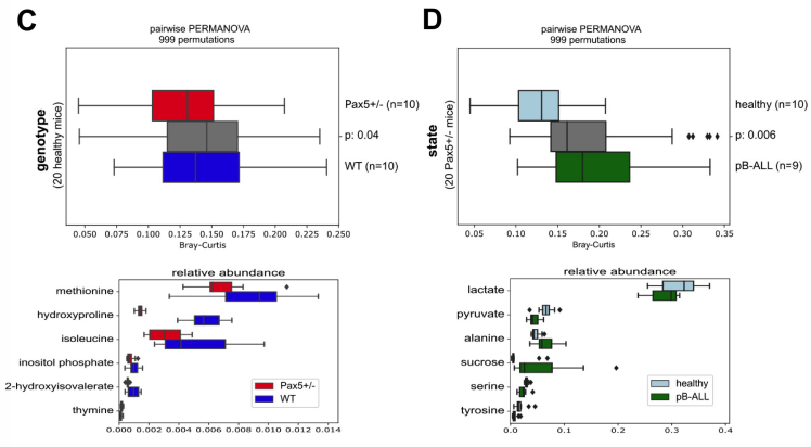 在這里,利用pB-ALL的小鼠模型,我們的結(jié)果表明,在生命早期抗生素治療引起的微生物群干擾足以在遺傳易感小鼠中誘發(fā)白血病,即使在沒有感染性刺激和獨立于T細(xì)胞的情況下也是如此。通過對一系列糞便樣品進(jìn)行16S V4和16S rRNA全長測序,我們發(fā)現(xiàn)pB-ALL(Pax5雜合性或ETV6-RUNX1融合)的遺傳易感性形成了一個不同的腸道微生物群。使用3983個擴(kuò)增序列變異(ASV)中的40個作為細(xì)菌物種的替代物,機(jī)器學(xué)習(xí)準(zhǔn)確地預(yù)測了遺傳易感性(96.8%)。將野生型(WT)或Pax5+/-造血骨髓細(xì)胞移植到WT受體小鼠,發(fā)現(xiàn)微生物群是以供體基因型特異性的方式形成和確定的。氣相色譜-質(zhì)譜(GC-MS)分析來自WT和Pax5+/-小鼠的血清表明存在基因型特異性的獨特代謝組譜。綜上所述,我們的數(shù)據(jù)表明,是缺乏共生微生物群落,而不是特定細(xì)菌的存在,促進(jìn)了遺傳易感小鼠的白血病。未來需要進(jìn)行大規(guī)模的縱向研究,以確定對易患pB-ALL的兒童進(jìn)行有針對性的微生物群落調(diào)整是否能成為一種成功的預(yù)防策略。