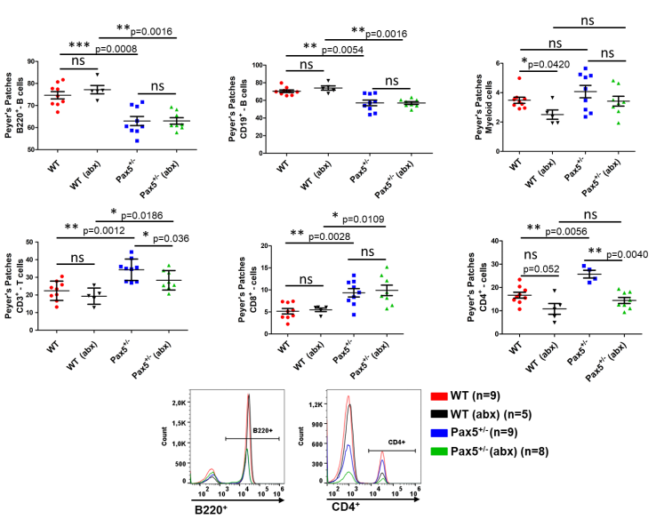 在23只小鼠中,11只(47.82%)在11.4到20.7月齡之間出現(xiàn)了PB-ALL,而SPF中未經(jīng)治療的Pax5+/-小鼠(n=12)沒有發(fā)生白血病(圖4A-D)。這些白血病在表型、組織學(xué)、克隆性和遺傳學(xué)特征上與暴露于自然感染的Pax5+/-小鼠中出現(xiàn)的白血病相似。這表明,完整的微生物群可以保護(hù)遺傳易感的小鼠免受白血病的侵襲,即使在沒有感染環(huán)境的情況下,通過抗生素治療后的細(xì)菌枯竭來改變微生物群也可能引發(fā)白血病。