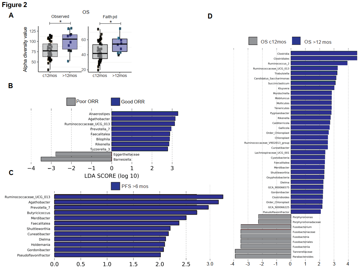 作者檢測(cè)的隊(duì)列中所有患者alpha多樣性在OS>12個(gè)月和OS<12個(gè)月的患者之間差異不顯著。依據(jù)臨床數(shù)據(jù)比較了組間GM的組成。在PFS>6個(gè)月的患者中,Ruminococcaceae UCG 13 ?Agathobacter富集。在OS>12個(gè)月的患者中Lachnospiraceae UCG 001富集。