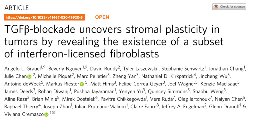 本研究使用先前建立的方法來解析罕見的基質(zhì)細胞,并將其與技術(shù)結(jié)合,包括單細胞RNAseq和空間轉(zhuǎn)錄組學(xué),來定義與離散CAF(成纖維細胞)表型相關(guān)的基因功能,揭示了預(yù)測的特征和新描述的性狀。通過在體內(nèi)使用TGFβ中和抗體,作者還發(fā)現(xiàn)了一批干擾素許可的具有卓越免疫調(diào)節(jié)潛能的CAF的存在。觀察到的變化與免疫檢查點阻斷具有深層次的相關(guān)性,這表明CAF是一個可塑實體,可用于癌癥治療。