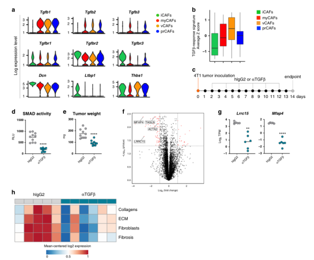 綜上所述,這些數(shù)據(jù)促使我們研究TGFβ-阻斷劑在體內(nèi)對CAF表型和功能的相對影響。為此,6周齡雌性小鼠接種4T1腫瘤細胞,隨后用TGFβ阻斷抗體或同型對照處理,研究設(shè)計如圖2c所示。結(jié)果表明這種腫瘤進展的延遲似乎不是由抗TGFβ對腫瘤細胞的直接作用引起的,更可能是TGFβ阻斷后微環(huán)境變化的結(jié)果。事實上,使用TGFβ中和抗體可導(dǎo)致整體基因表達的顯著差異,這在對大量冷凍腫瘤RNAseq分析中得到證實(圖2f)。與這些發(fā)現(xiàn)一致的是,我們通過分析與膠原沉積和纖維化相關(guān)的基因特征,描述了抗tgfβ治療小鼠腫瘤中整體促纖維化程序的顯著減少(圖2h)。綜上所述,這些數(shù)據(jù)表明靶向TGFβ影響了腫瘤微環(huán)境中的成纖維細胞動力學(xué)。