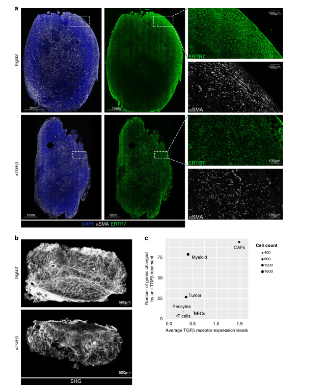 根據(jù)觀察到的基因表達變化,作者利用冷凍保存的腫瘤從同型或抗tgfβ處理小鼠切片,染色和共聚焦顯微鏡成像等方法確定了TGFβ-阻斷是否對構(gòu)成腫瘤建筑框架結(jié)構(gòu)產(chǎn)生損傷。Acta2表達的鏡像變化,肌成纖維細胞網(wǎng)絡(luò)的顯著改變,細長的紡錘形細胞稀少等揭示了瘤內(nèi)結(jié)構(gòu)組織的顯著變化,表明TGFβ阻斷抗體處理小鼠的高網(wǎng)狀纖維網(wǎng)絡(luò)丟失(圖3a)。通過對全器官的斷層掃描,進一步證實了膠原骨架形成的整體損傷,如圖3b所示。單細胞RNAseq分析結(jié)果表明基因的數(shù)量受anti-TGFβ治療明顯更大 (圖3 c),也與先前的結(jié)果一致。