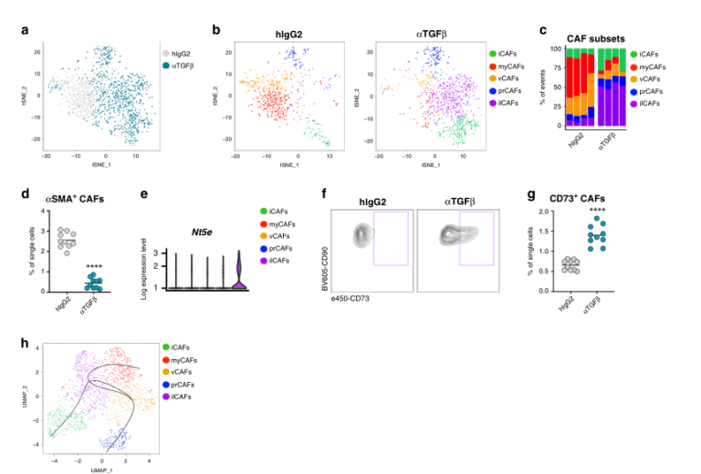 5.?TGFβ-阻斷導(dǎo)致myCAFs的丟失和CD73 +成纖維細胞的出現(xiàn)