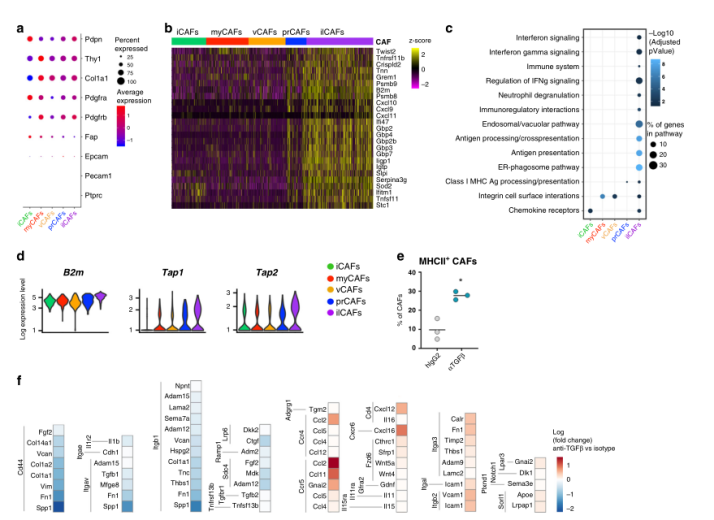 為了獲得關(guān)于新鑒定的CAF亞群功能特性的更多信息,作者研究了這類亞群的轉(zhuǎn)錄特征。然而,對ilCAFs中差異表達基因分析發(fā)現(xiàn),在干擾素(IFN)信號控制下許多鳥苷晚結(jié)合蛋白(Gbp)家族成員發(fā)生富集(圖5b)。與這些發(fā)現(xiàn)一致的是,在區(qū)分ilCAFs與其他CAF亞群的基因中, ilCAFs中IFN信號反應(yīng)上調(diào),IFN水平調(diào)控的通路增強,包括抗原加工和展示(圖5c)。編碼MHC蛋白和MHC相關(guān)分子的基因在ilCAFs中高表達(圖5b-d)。體內(nèi)TGFβ-阻斷后,在CAFs中檢測到MHCII蛋白上調(diào)(圖5e),也發(fā)現(xiàn)ilCAFs在腫瘤內(nèi)對指導(dǎo)T細胞的轉(zhuǎn)運發(fā)揮重要作用(圖5b)。