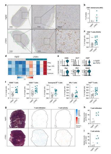 TGFβ-中和后CAF重塑,特別是具有潛在T細胞調(diào)節(jié)活性的CAF亞群的出現(xiàn),促使我們確定TGFβ-阻斷對建立抗腫瘤免疫反應(yīng)的影響。由于ilCAFs中T細胞趨化分子基因表達升高,CD8免疫組化染色顯示細胞毒性T細胞浸潤在治療組之間存在較大差異(圖6a)。流式細胞分析證實了TGFβ-阻斷作用下細胞毒性T細胞數(shù)量的增加(圖6c),支持TGFβ-阻礙可能導(dǎo)致免疫細胞反應(yīng)的全面覺醒。在單細胞水平上也證實了這些發(fā)現(xiàn)。為了評估這種與浸潤T細胞組織分布相關(guān)的激活程度,我們隨后通過空間轉(zhuǎn)錄組分析生成了與T淋巴細胞存在及其活性相關(guān)基因的腫瘤路圖。