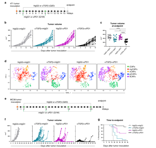到目前為止所描述的數(shù)據(jù)表明,TGFβ-阻斷形成了腫瘤成纖維細胞的形態(tài),在CAFs中釋放了IFN信號,促進了細胞毒性T細胞的浸潤和激活。由于這些變化被預(yù)測有助于產(chǎn)生抗腫瘤免疫反應(yīng),我們測試TGFβ中和與阻斷免疫治療具有協(xié)同作用。結(jié)果表明單獨抗pd1并不影響4T1腫瘤的生長,單獨使用TGFβ-阻斷劑則顯示出一些活性(圖7c),TGFβ中和可以促進PD1免疫治療,在這種難以治愈的腫瘤模型中(圖7c),聯(lián)合抗TGFβ和抗pd1治療后,CAF和ilCAFs外觀明顯重塑(圖7d)。重要的是,TGFβ-阻斷在該模型中導(dǎo)致腫瘤微環(huán)境發(fā)生明顯變化,表明基質(zhì)免疫重構(gòu)。