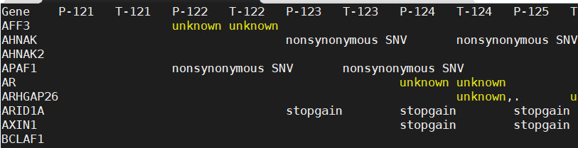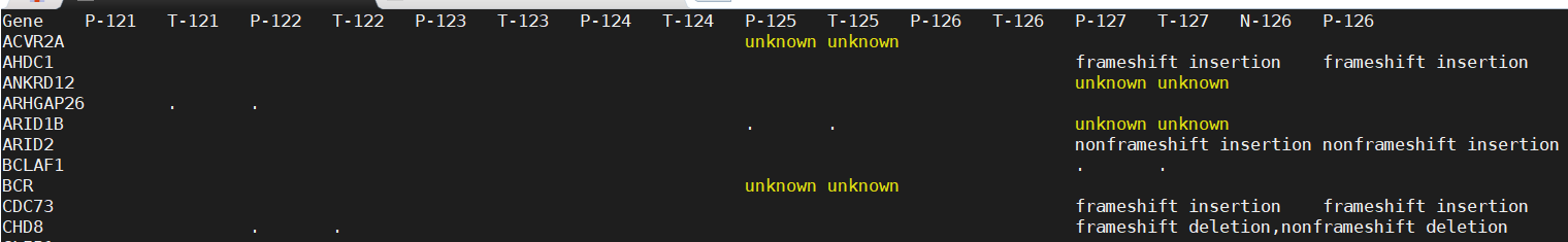 rownames(mat)<-mat$Gene mat<-mat[which(rownames(mat)%in%test$gene_symbol),] mat<-mat[,-1] mat[is.na(mat)]<-"" mat<-Replace(mat,from?=?"^.$",to?=?"?",pattern?=?"") #此處Replace是R包do中的函數(shù),將文件中的內(nèi)容替換成自己所需要的內(nèi)容 mat<-Replace(mat,from?=?"^,.",to?=?"?",pattern?=?"") mat<-Replace(mat,from?=?",.$",to?=?"?",pattern?=?"") mat<-Replace(mat,from?=?"^.,",to?=?"?",pattern?=?"") mat<-Replace(mat,from?=?"nonframeshift?deletion,frameshift?deletion",to?=?"frameshift_mutation",pattern?=?"") mat<-Replace(mat,from?=?"frameshift?deletion,nonframeshift?deletion",to?=?"frameshift_mutation",pattern?=?"") mat<-Replace(mat,from?=?"nonframeshift?deletion",to?=?"other",pattern?=?"") mat<-Replace(mat,from?=?"nonframeshift?insertion",to?=?"other",pattern?=?"") mat<-Replace(mat,from?=?"frameshift?deletion",to?=?"frameshift_mutation",pattern?=?"") mat<-Replace(mat,from?=?"frameshift?insertion",to?=?"frameshift_mutation",pattern?=?"") mat<-Replace(mat,from?=?"unknown",to?=?"other",pattern?=?"") #oncoPrint(mat) #指定變異類型的標(biāo)簽,和數(shù)據(jù)中的類型對應(yīng) heatmap_legend_param<-list(title="Indel",at=c("frameshift_mutation",?"other"),labels=c("frameshift_mutation",?"other")) #設(shè)定標(biāo)題 column_title<-"Indel?Oncoplot" ht2<-oncoPrint(mat,alter_fun?=?alter_fun,col=col,column_title=column_title,heatmap_legend_param?=?heatmap_legend_param,remove_empty_columns?=?F,remove_empty_rows?=?F,show_column_names?=?T,show_row_names?=T) mat?<-read.table("keygene.SNP.xls",head=T,sep="\t",stringsAsFactors?=?FALSE)