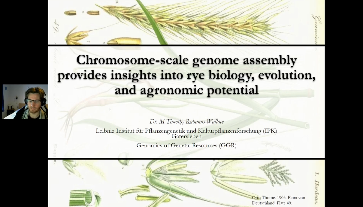 德國萊布尼茨植物遺傳與作物研究所Timothy Rabanus-Wallace 博士講述了黑麥基因組破譯所面臨的挑戰(zhàn),并細(xì)致全面的講述了本次研究聯(lián)合短讀長、Hi-C、10×Genomics、遺傳圖譜及光學(xué)圖譜等技術(shù)如何破譯歐洲栽培黑麥“Lo7”基因組。解析了黑麥基因間空間的演化,以及抗病、抗寒與自交不親和等生物學(xué)過程的發(fā)生與作用機(jī)制,揭示了黑麥易位染色體片段對小麥遺傳改良的重要作用。Timothy 博士表示,未來可以基于品種間Hi-C基因組定位,在威寧黑麥和Lo7基因組間進(jìn)行系統(tǒng)的結(jié)構(gòu)比較,研究不同品系黑麥基因組間的大片段結(jié)構(gòu)變異。