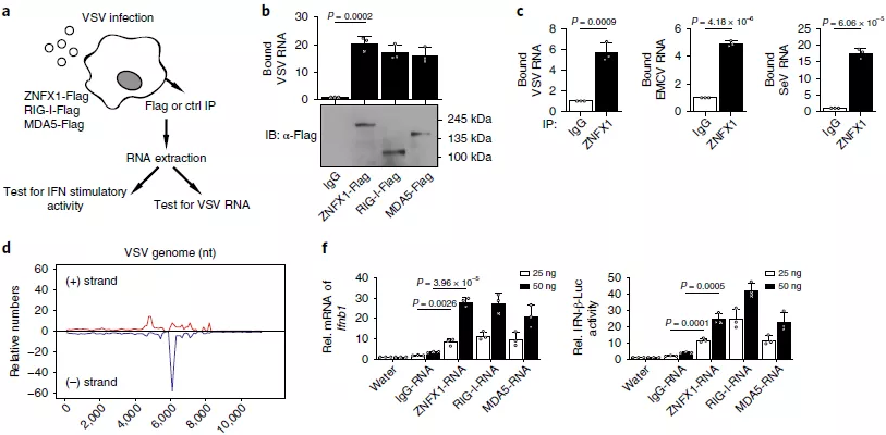 屬于RNA解旋酶SF2的許多基因被鑒定為結(jié)合病毒RNA的RNA病毒傳感器,因此假設(shè)屬于SF1的ZNFX1也可能作為RNA傳感器結(jié)合病毒RNA。為證實這一假設(shè),首先在293T細胞中過表達ZNFX1,然后進行pulldown和qRT-PCR分析以確定ZNFX1與VSV-RNA的高結(jié)合能力(圖5a,b)。也檢測了內(nèi)源性ZNFX1與A549細胞中的VSV,EMCV和仙臺病毒(SeV)RNA的結(jié)合能力(圖5c)。通過用抗內(nèi)源性ZNFX1的抗體從免疫沉淀物中分離RNA來進行RNA免疫沉淀(RIP)測序分析,將ZNFX1相關(guān)的RNA比對到VSV基因組(圖5d),優(yōu)先定位于約6,000-8,000 nt的VSV片段(圖5e)。值得注意的是,當(dāng)與ZNFX1相關(guān)的RNA轉(zhuǎn)染到A549細胞中時,通過qRT-PCR和熒光素酶活性分析觀察到了Ifnb1的誘導(dǎo)轉(zhuǎn)錄和基于Ifnb1啟動子的報告基因的誘導(dǎo)表達(圖5f)。