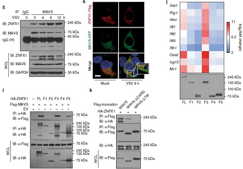 為了更深入地了解ZNFX1在抗病毒應(yīng)答中的作用,進行了qRT-PCR或免疫印跡分析,以了解VSV感染或干擾素誘導(dǎo)劑聚肌胞苷酸(poly(I:C))刺激A549細胞、外周血單個核細胞(PBMC)或小鼠胚胎成纖維細胞(MEF)細胞后ZNFX1的表達上調(diào)(圖1b–d)。qRT-PCR也證實了靜脈注射VSV后小鼠脾臟和肺中Znfx1的豐度上調(diào)(包括胸腺、淋巴結(jié)脾臟和肺)(圖1e)。作者還對先前收集的芯片數(shù)據(jù)集(GDS4231/4214/1271/3210/6082/6063)進行了統(tǒng)計分析,發(fā)現(xiàn)與健康對照相比,在HIV感染患者和猿猴免疫缺陷病毒(SIV)引起的腦炎猴子中,Znfx1的RNA水平明顯更高(圖1f,g)。此外,在不同的細胞類型(包括巨噬細胞、樹突狀細胞和上皮細胞)中感染病毒后,Znfx1的轉(zhuǎn)錄顯著增加。這些數(shù)據(jù)都表明ZNFX1可能是抗病毒分子。