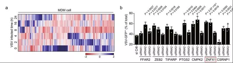 作者首先分析了他們先前發(fā)表的被水皰性口炎病毒(VSV)感染的單核細胞衍生巨噬細胞(MDM)的IVT-SAPAS(in vitro transcription-sequencing alternative polyadenylation sites)數(shù)據(jù),并發(fā)現(xiàn)了許多表達改變的基因?!局耙寻l(fā)表文章的數(shù)據(jù)重新挖掘】通過比較受VSV感染的人MDM數(shù)據(jù)和小鼠腹膜巨噬細胞數(shù)據(jù),發(fā)現(xiàn)了一些共同的基因,它們被上調(diào)了三倍以上,包括FFAR2,ZEB2,TIPAP,PTGS2,CMPK2,ZNFX1和CSRNP1。隨后敲除A549細胞中的這些基因,用VSV-eGFP(VSV-增強型綠色熒光蛋白)感染細胞,流式細胞術(shù)檢測GFP陽性細胞的百分比表明,敲減ZNFX1(其抗病毒作用尚未見報道)促進了VSV感染。