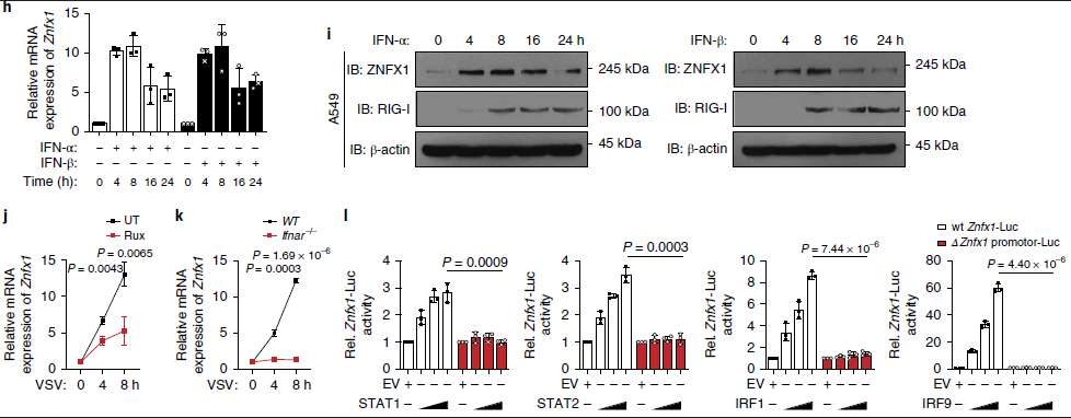 由于病毒感染導(dǎo)致ZNFX1的mRNA和蛋白質(zhì)水平表達均增強,接下來通過將A549細胞與人重組IFN-α和IFN-β一起孵育來檢測ZNFX1是否為ISG。qRT-PCR和免疫印跡分析的結(jié)果表明ZNFX1的表達可以被IFN-α和IFN-β誘導(dǎo)(圖1h,i)。相比之下,JAK1抑制劑魯索替尼(ruxolitinib)可以抑制VSV對Znfx1 mRNA的誘導(dǎo),并且在Ifnar1-/-A549細胞中幾乎消失(圖1j,k)。