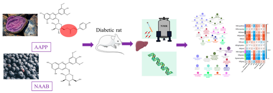 花色苷是植物中的一大類多酚化合物,目前已知是對(duì)氧化應(yīng)激、炎癥和能量穩(wěn)態(tài)有調(diào)節(jié)作用。已有報(bào)道發(fā)現(xiàn)花色苷具有抗糖尿病的療效。花色苷的核心結(jié)構(gòu)是花青苷,它可以糖基化形成非酰化的花青苷,糖苷可以?;笮纬甚;幕ㄇ嘬铡G易罱醒芯勘砻?,與未酰化的花青苷相比,?;ㄇ嘬站哂懈玫姆€(wěn)定性和抗氧化活性。本研究利用全長(zhǎng)轉(zhuǎn)錄組學(xué)和核磁共振代謝組學(xué)方法,比較了非酰化和?;ㄉ諏?duì)糖尿病大鼠肝臟基因表達(dá)和代謝的影響。這是第一次綜合應(yīng)用這兩種強(qiáng)大的技術(shù)來(lái)研究肝臟基因表達(dá)和代謝產(chǎn)物的變化。