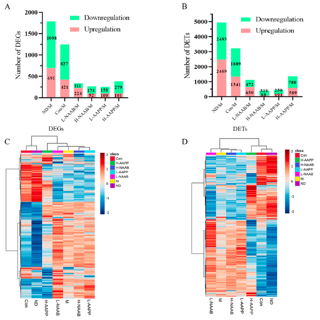 對(duì)全長(zhǎng)轉(zhuǎn)錄組數(shù)據(jù)進(jìn)行分析發(fā)現(xiàn),在6個(gè)不同組之間的差異分析結(jié)果中,健康對(duì)照組和糖尿病模型之間有691個(gè)上調(diào)和1098個(gè)下調(diào)的DEGs,2469個(gè)上調(diào)和2483個(gè)下調(diào)的DETs (圖1A和B)。與M組相比,H-AAPP處理改變了最多的基因和轉(zhuǎn)錄本(101個(gè)上調(diào)和179個(gè)下調(diào)的DEGs,89個(gè)上調(diào)和780個(gè)下調(diào)的DETs)。DEGs和DETs的熱圖顯示,ND組和CON組在基因表達(dá)模式上與M組有很大不同,而且H-AAPP組的轉(zhuǎn)錄組圖譜似乎比M組更接近ND組和CON組(圖1C和D)。