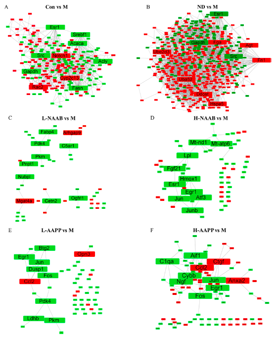 對(duì)不同分組中的DEGs進(jìn)行ClueGO分析,以生成按功能分組的注釋網(wǎng)絡(luò)圖(圖4A?F)。在CON/M差異分組的結(jié)果中,DEGs主要富集在羧酸生物合成過(guò)程、單羧酸代謝過(guò)程和對(duì)其他有機(jī)物的反應(yīng)過(guò)程。在ND/M分組差異結(jié)果中,脂肪酸代謝過(guò)程、羧酸代謝過(guò)程和對(duì)有機(jī)物的反應(yīng)過(guò)程是富集排名前3的功能分組。在ND/M和CON/M分組中,DEGs主要在單羧酸代謝過(guò)程、羧酸生物合成過(guò)程、脂肪酸代謝過(guò)程、脂肪代謝過(guò)程和對(duì)有機(jī)物的反應(yīng)過(guò)程相關(guān)的通路中富集。在L-NAAB/M分組差異結(jié)果中,DEGs組要與三個(gè)功能通過(guò)有關(guān):質(zhì)膜組織、感覺(jué)調(diào)節(jié)和細(xì)胞對(duì)脂肪酸的反應(yīng)。在H-NAAB/M差異結(jié)果中,DEGs主要富集于基因沉默的負(fù)調(diào)控、甘油三酯代謝過(guò)程的調(diào)控以及RNA聚合酶II啟動(dòng)子對(duì)脅迫反應(yīng)的轉(zhuǎn)錄調(diào)控。在L-AAPP/M比較中,DEGs在甘油三酯分解代謝過(guò)程、骨骼肌細(xì)胞分化和軸規(guī)范方面都明顯富集。在H-AAPP/M差異結(jié)果中,發(fā)現(xiàn)轉(zhuǎn)錄因子AP-1復(fù)合體、細(xì)胞對(duì)白細(xì)胞介素-1的反應(yīng)以及RNA聚合酶II核心啟動(dòng)子序列特異性DNA結(jié)合等通路顯著富集。