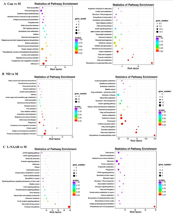 接下來(lái),進(jìn)行了KEGG通路富集分析。氣泡圖展示富集最顯著的前20條通路(圖5A?F)。與M組相比,Con組上調(diào)的DEGs主要富集于以下通路:苯丙氨酸、酪氨酸和色氨酸的生物合成,亞油酸代謝,金黃色葡萄球菌感染,補(bǔ)體和凝血級(jí)聯(lián)反應(yīng),以及甲型流感病毒。ND組與M組相比,上調(diào)的DEGs主要富集在花生四烯酸代謝、金黃色葡萄球菌感染、移植物抗宿主病、吞噬小體等通路中,而ND組與M組相比上調(diào)的DEGs主要富集在以下通路:苯丙氨酸、酪氨酸和色氨酸的生物合成、亞油酸代謝、金黃色葡萄球菌感染、移植物抗宿主病、吞噬小體。在CON/M和ND/M比較中,下調(diào)的DEGs在相似的KEGG通路中富集:不飽和脂肪酸的生物合成、脂肪酸代謝、丙酮酸代謝、脂肪酸伸長(zhǎng)、氧化磷酸化和碳代謝。