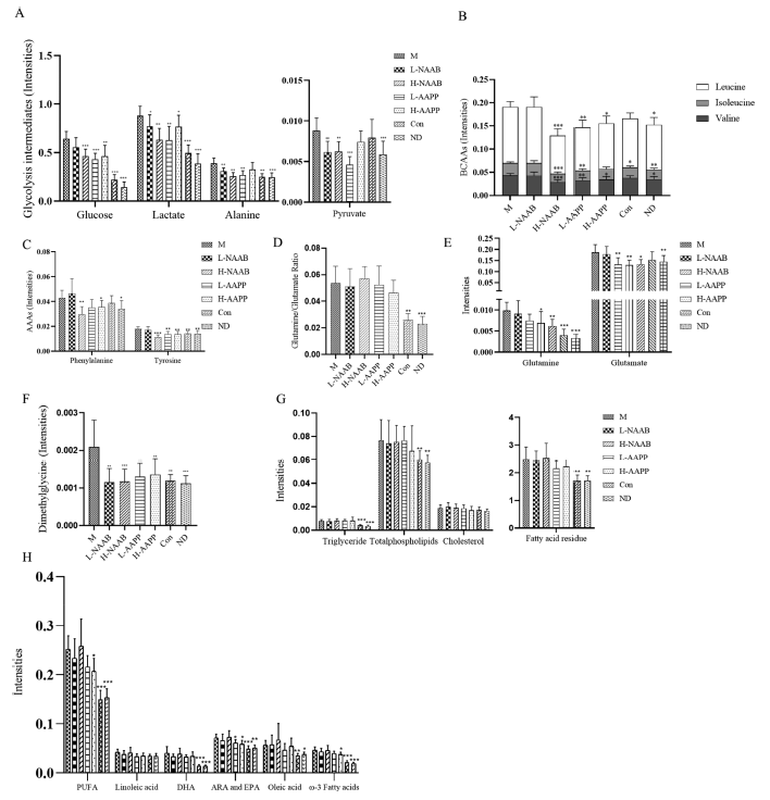 然而,ZDF大鼠中谷氨酰胺/谷氨酸比值對(duì)花青苷提取物無(wú)反應(yīng)(圖6D),但L-AAPP和H-AAPP降低谷氨酰胺和谷氨酸,H-NAAB降低谷氨酸(圖6E)。與M相比,所有花青苷處理組的二甲基甘氨酸升高的水平都被逆轉(zhuǎn)到正常狀態(tài)(圖6F)。與M組相比,編碼甜菜堿-同型半胱氨酸S-甲基轉(zhuǎn)移酶的BHMT均降低。在脂質(zhì)代謝產(chǎn)物方面,L-AAPP組和H-AAPP組的肝脂譜略有改善,表現(xiàn)為脂肪酸殘留量、包括ω-3脂肪酸在內(nèi)的不飽和脂肪酸和Ara+EPA的下降趨勢(shì)(圖6G?H)。M組顯示出總體脂質(zhì)譜增加,如高水平的磷脂、甘油三酯、脂肪酸和不飽和脂肪酸,所有這些都有助于脂肪肝的發(fā)展。L-AAPP和H-AAPP組通過(guò)調(diào)節(jié)脂肪酸殘基和不飽和脂肪酸略有改善肝脂代謝。